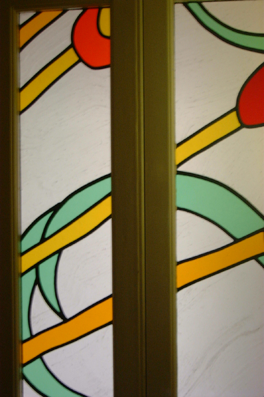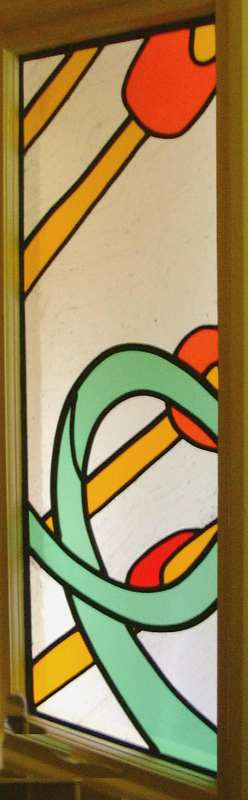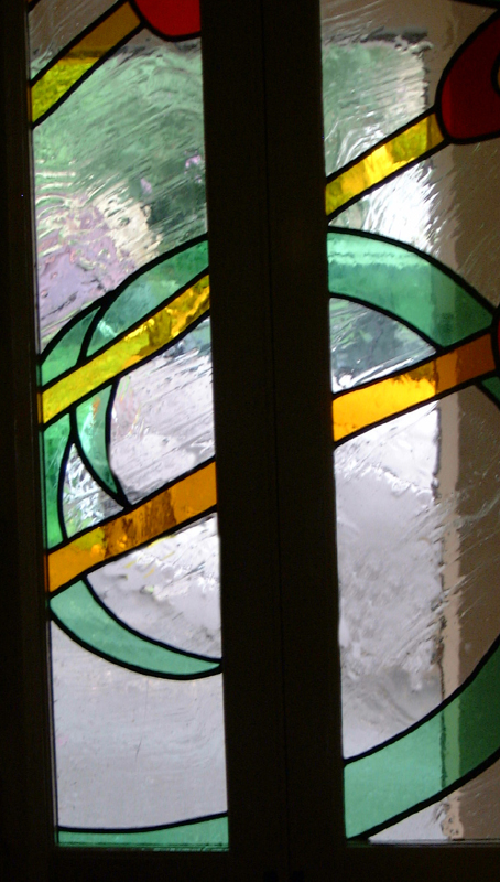 These three photos are part of an integrated front door panel stretching across several windows, inspired by Derek Jarman's garden. It is really difficult to photograph in situ because of the location, but these details give you an idea, though not a view of the whole thing: |